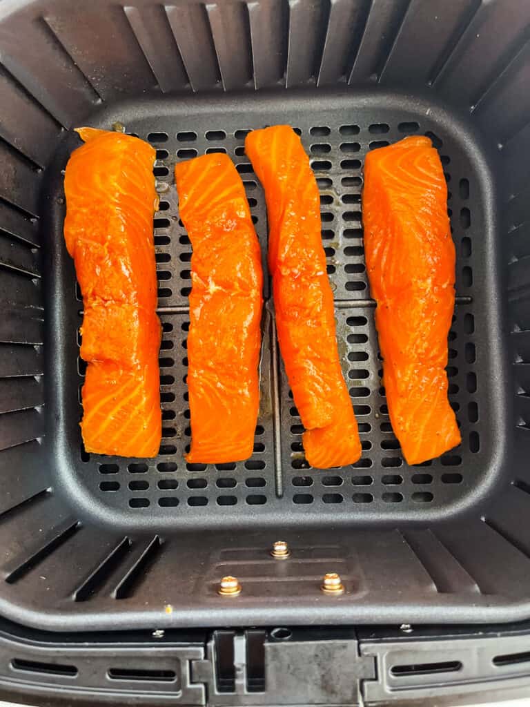 Air fry salmon for about 7 – 8 minutes depending on your preferred level of doneness.